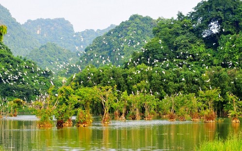 15:00: Explore Hang But (Buddhist Cave) The cave 500m in length, magical view of the stalactites and stalagmites, including a big Buddha-shaped stalactite sitting beside an underground river. Then get on a small sampan to visit Thung Nham bird park, discover the most features of this area with more than 50.000 birds of 40 species flying to inhabit every day.